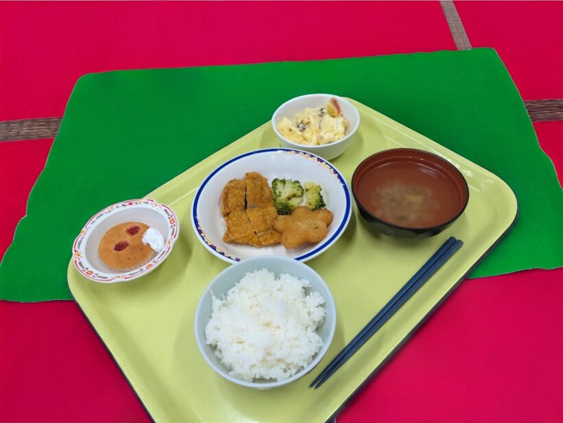 今月のイベント食はクリスマス献立です。フライドチキン、星のコロッケ、さつまいもとリンゴのサラダ、コンソメスープ、米粉のケーキでした。